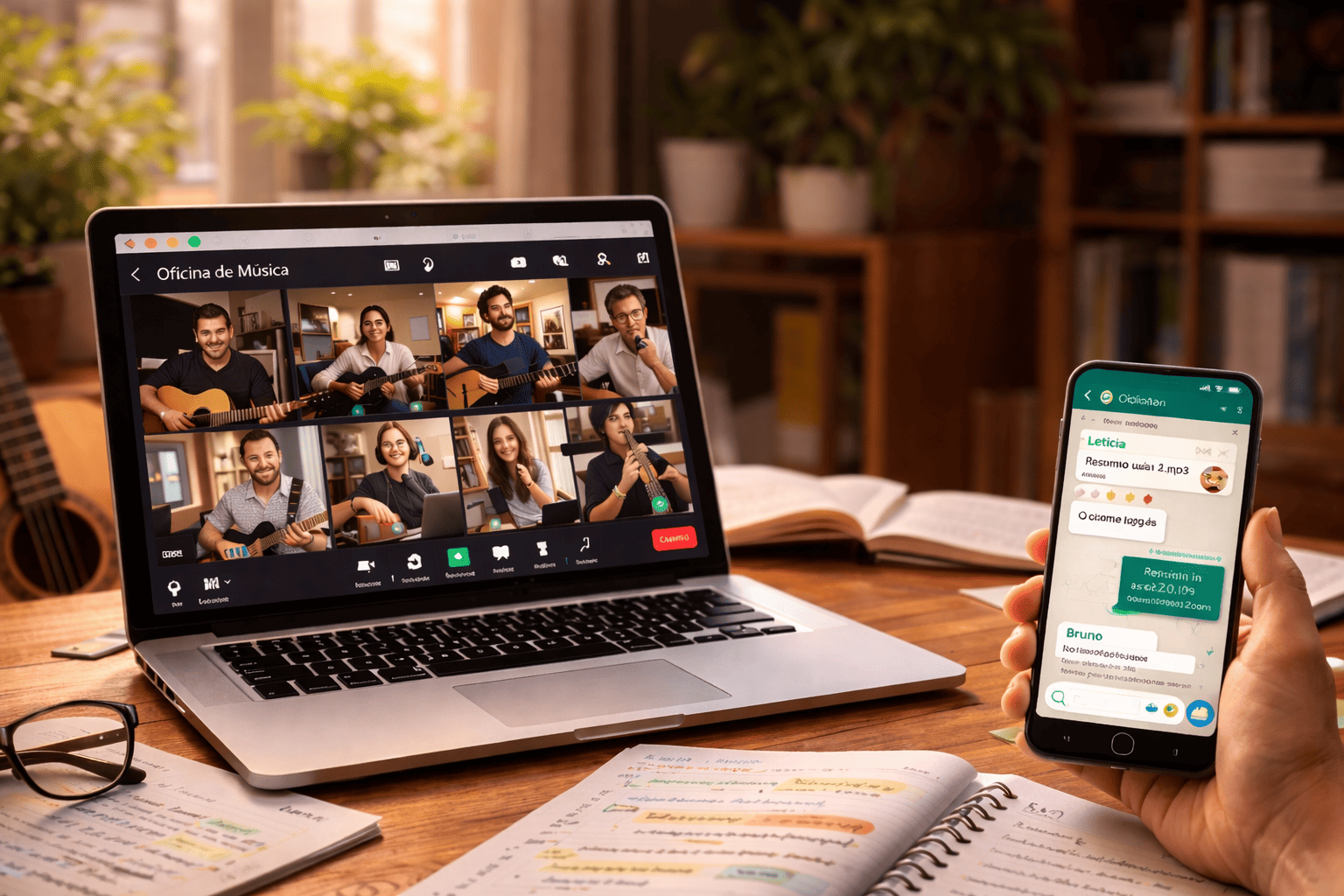 Uma coisa que pouca gente imagina é que, no remoto, “dar oficina” não é só dominar conteúdo musical. É dominar forma de entrega.